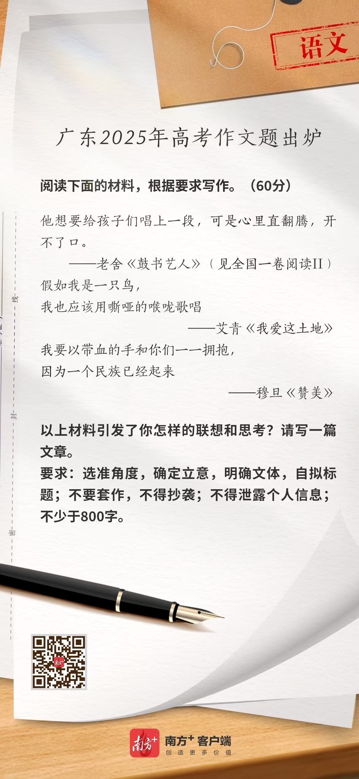 本年的高考作文,不再议论互联网和东说念主工智能,而所以大视线、大风光、大情愫关联体裁经典,关涉更动体裁,带领考生念念考咱们的以前、当前和畴昔。爱着,想要给孩子们唱上一段,心里却直翻昂扬,开不了口,这是因为民族的疾苦还在;即即是喉咙沙哑,也要像鸟一样歌颂,这是因为我爱着这地皮;即使含辛菇苦,手上带着鲜血,也要和你们逐个拥抱,这是因为一个民族依然醒觉、正在奋起。